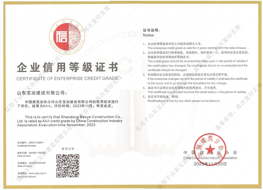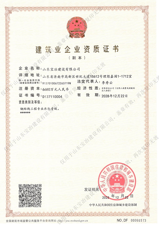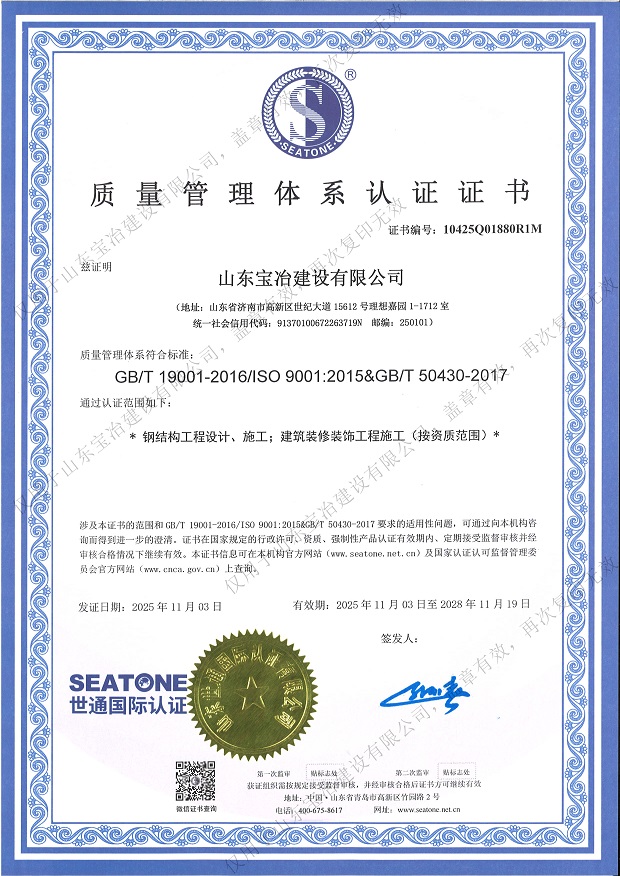 山東寶冶建設有限公司地處山東省濟南市高新技術開發區。經過多年的發展,現已具備建筑施工總承包、電力工程施工總承包、承裝(修、試)電力設施專業承包、鋼結構工程專業承包、特種工程(結構補強)專業承包、建筑裝修裝飾工程專業承包、建筑機電安裝工程專業承包、建筑幕墻工程專業承包、消防設施工程專業承包、防水防腐保溫工程專業承包、輕型鋼結構工程設計專項資質,可承接上述資質承攬范圍內的工程設計與施工。